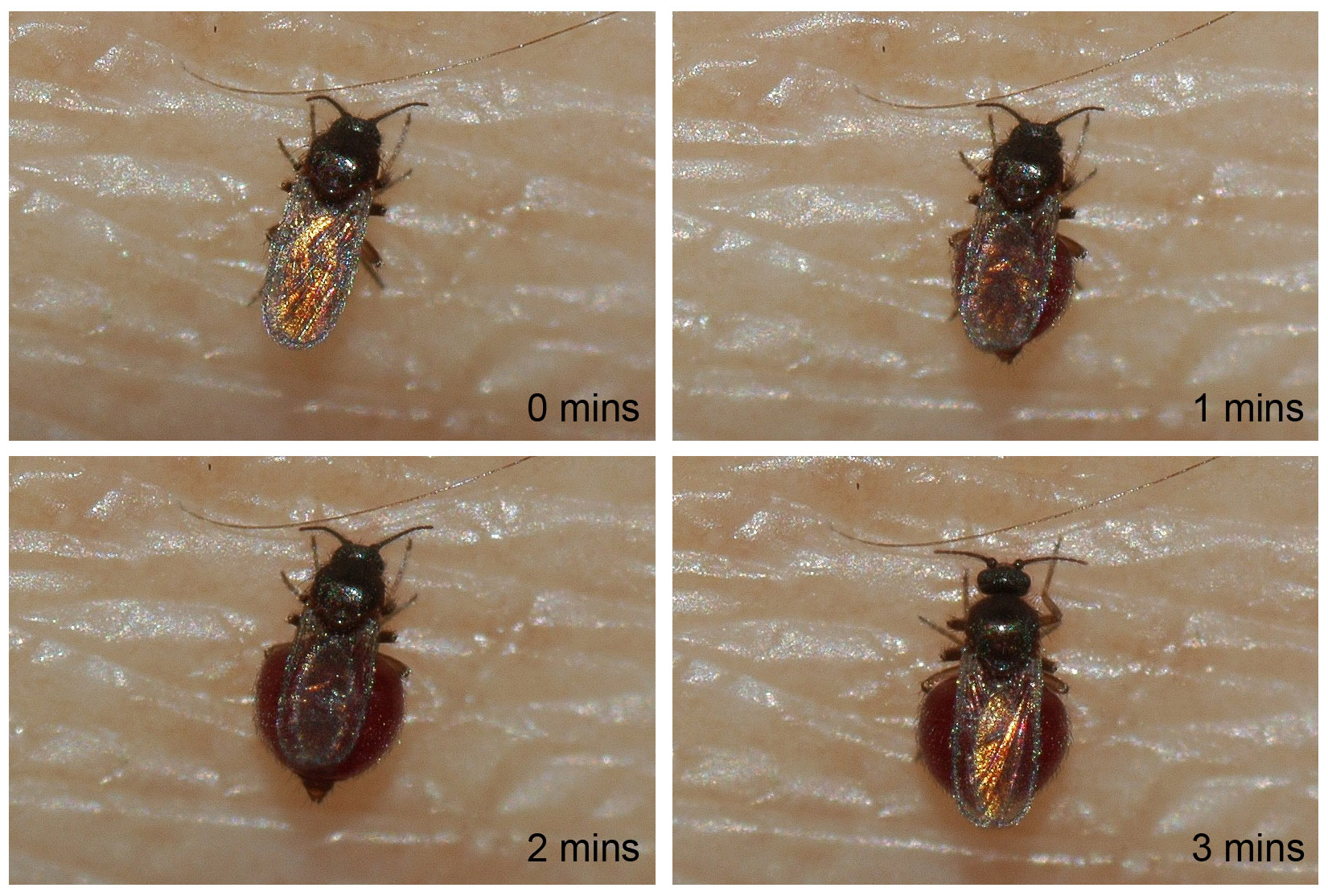 「小黑蚊必須吸食血液才能繁殖後代,但就像蚊子一樣,只有雌成蟲才會吸食人血」。由於小黑蚊比芝麻還小,受害者往往不易察覺,待有癢感時,它早已吸飽血。大部份的人們被叮咬後,患處隨即紅腫,有些甚至會有一點皮下出血或起水泡,奇癢難忍,在門診常會碰到反應比較激烈的患者需要就醫治療。這些紅疹大多持續數日,嚴重時症狀可以持續 28天以上,有些會留下暫時性的色素沉澱。